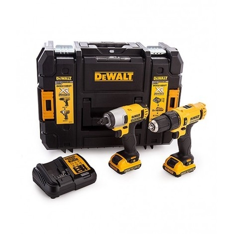 Kit DCK218D2T de la marca Dewalt. Kit compuesto por el taladro percutor DCD716 Combi-Drill y el atornillador de impacto DCF815. Este kit también tiene 2 baterías de 2.0 Ah y cargador de 10.8V y maletín Tstak.